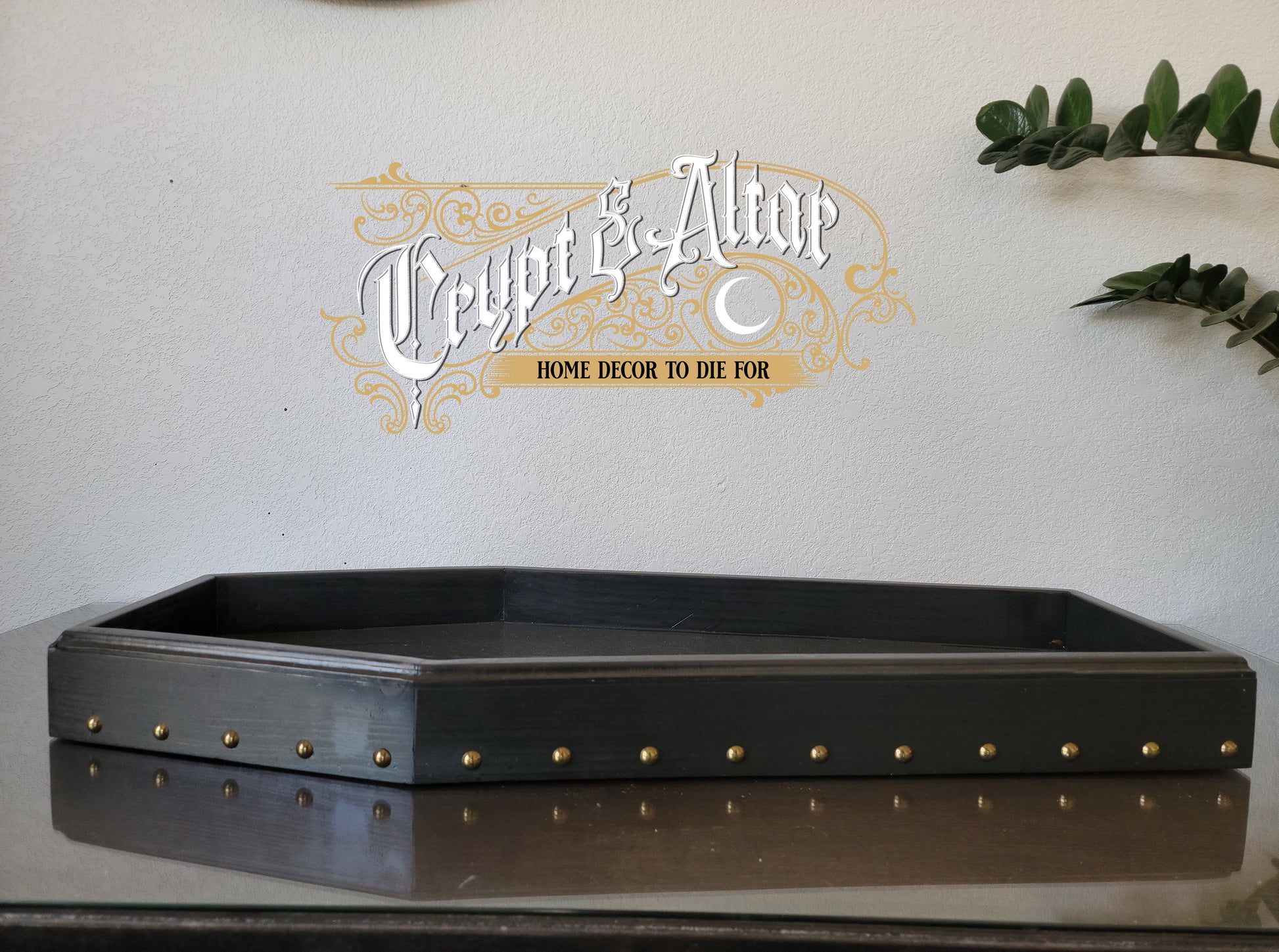 The Crypt & Altar Coffin Serving Tray is designed to be the vessel for purveying all manner of materials. Need to transport delicate instruments to you ritual circle, no problem! Bringing glasses of punch to those attending your seance, use the Crypt & Altar Serving Tray! Handmade and finished the Crypt & Altar serving tray is designed to last and has enough space to be a substantial addition to your entertaining and serving materials at 31" long and 13" wide.